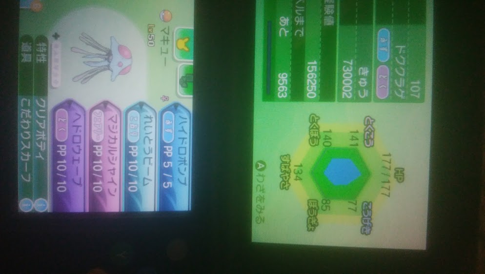 種族値・・・H80 A70 B65 C80 D120 S100 特性・・・ クリアボディ・へどろえき (夢)あめうけざら 特殊耐久に優れている、何世代も海を守り続けてきたクラゲですね。意外にも素早さは100族なんです。 ずっと使ってきましたが、7世代で新たな個体を作り運用中です。それがこちら あれ・・・横向き。すみません。 あくまで統一用のクラゲではありますが、使いやすいのはやっぱりスカーフです。 努力値・・・H172・C228・S108 実数値(Lv50)H177 Ax B85 C141 D140 S134 調整・・・ Sはスカーフで最速130族抜き。Cは冷凍ビームでH4振りガブ確1です。残りをHに振っています。H252振っているランドでも高乱数1になるのでガブ、ランドなどの毒統一に出てくる地面をスカーフビームでヤルのが仕事です。 ランドは交換警戒でトンボで逃げることが多いですのでどう読み勝つかがカギになります。 ガブはスカーフ、タスキじゃない限りヤレます。 タスキの場合・・・いけ!ビーム!!!タスキが発動!ガブリアスはけんのまいを使った!→ビームで瀕死or交代先にビーム。 スカーフの場合・・・いけ!ビーム!!!ガブリアスの地震・・・・ スカーフだったのね・・・ドククラゲは瀕死。 メガガブの場合も50%くらいの乱数で耐えられて返り討ちに合います。。 こんなドククラゲですが、ガブを吹き飛ばすときは爽快です。 耐久型やメガネなど色々な型を使いましたが、今の環境ではこいつで潜り続けていくと思います。 ここまでだらだらした文章を見てくれてありがとうございました! また次回も毒ポケモンと共に! PR